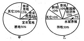 小题1:本题主要考查土地利用类型问题。由甲、乙两省区土地利用现状饼状图可知:甲地耕地占整个地区土地利用的56%所以甲地适宜发展种植业,乙地林地整个地区土地利用的一半地形以山地为主宜发展生态型立体农业不宜修筑梯田,发展粮食生产。所以选C。
