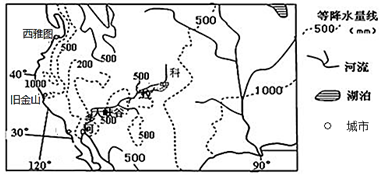 读 “美国中西部降水分布”图,比较北京与西雅图降水特点及原因。(10分)