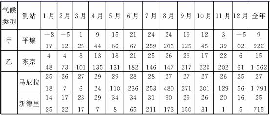 表中数据上行:平均气温(℃) 下行:降水量(mm)