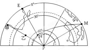 材料1?下图是以极点为中心的东半球图。此刻,曲线MN上各点太阳高度为0°,MN与EP相交于N点。该季节,北美大陆等温线向北凸出。