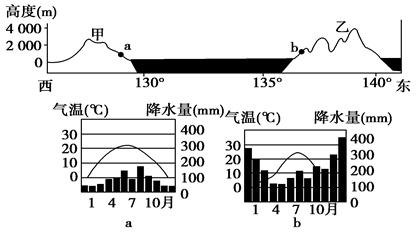 4、综合题 读沿36°N的地形剖面图和图中a、b两地的气候资料,完成下列问题。(12分)