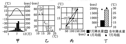 B.乙气候类型分布在除南极洲以外的所有大洲