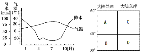 5、综合题 读下图左某地气温和降水变化曲线图,回答下列3道问题。