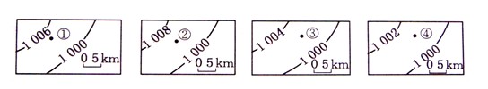 4、单选题 下图四幅等压线分布图中①②③④四地风力由大到小的正确排序是