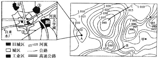 2、综合题 下面右图是北半球部分地区某时刻地面等压线图,左图是A城空间结构图,读图回答下列问题。