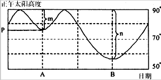 4、综合题 读“北半球某纬度正午太阳高度的年变化图”,若图中m、n数值相差20°,回答下列问题。