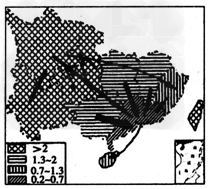 3、单选题 下图是我国部分省区的人口承载状况(实际人口密度与理论人口承载密度之比)及20世纪80年代下半期人口流动示意图。读图,回答1—3题。