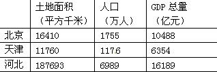 小题1:(5分)北京;人均GDP远高于其他两地;北京以第三产业比重大,第一产业比重非常小;天津以第二产业为主;河北以第二产业为主,但是积极发展第一产业和第三产业