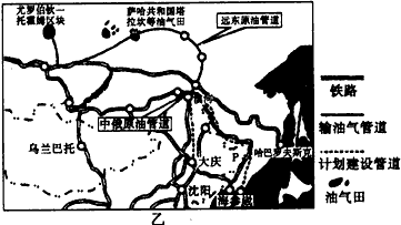 ? 2009年5月18日上午,中俄原油管道工程中圆境内段在黑龙江省漠河县兴安镇正式开工建设,该管道北起漠河,在穿越多处冻土层、冻土沼泽、河漫滩地和大兴安岭林区后,到达南端终点站大庆。管道建成后将承担我国约六分之 一的石油进口任务。乙图为中俄原油管道和俄罗斯远东管道图。