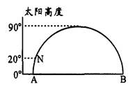 3、单选题 图中纵轴表示太阳高度,AB为晨昏线,ANB为经线圈的一部分,其中,N为北极点,经线NA为64°W。据图回答问题。