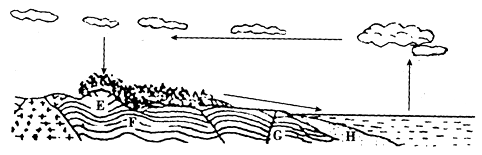 【小题2】E处岩层向下弯曲,为向斜;F处岩层向上弯曲,为背斜构造,其顶部被侵蚀,形成山谷(地貌);G处为断层,地壳不稳定,不宜修建大型工程;H处位于浅海大陆架地区,沉积作用强,为沉积岩。