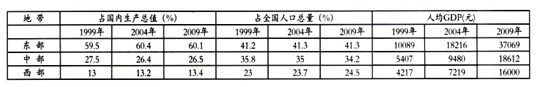 表中数据为三个经济地带10年间主要经济指标的发展情况,图为1980~2009年三个经济地带GDP增长。结合图和表中信息,完成下面3题。