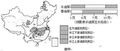 材料一:我国油菜优势产区分布图和我国冬、春油菜生长阶段示意图(图甲)