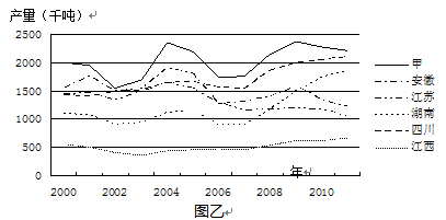 (1)读图乙,甲省油菜籽产量最高,将图甲与图乙对照,可以看到,甲省是湖北省,简称鄂。根据图乙判断,2009~2011年该省油菜籽平均年产量约2300±50千吨。
