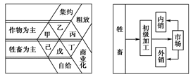 小题2:右图表示以养殖业为主,产品主要供销售,故符合大牧场放牧业,反映在左图中,属于牲畜养殖为主,集约型商品化生产,故丁符合。