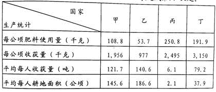 (1)读表格,根据数值分析,丙、丁两国投入的生产资料多,产量高,潜力小。甲乙两国投入的少,产量低,只要加大科技投入,产量会大幅度提高,潜力大,A对。B、C、D错。
