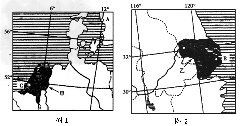 5、综合题 读图,指出图1中甲阴影区与图2中乙阴影区农业结构的不同,并分析其形成的主要自然原因。