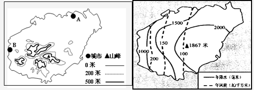 材料一:左图为海南岛等高线地形图,右图为海南岛降水与风能分布图。