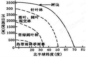 小题2:根据图示直接反映树线受纬度位置和海拔高度的影响;且由于降水量的差异影响植被的分布,故也应与树线的分布有关。