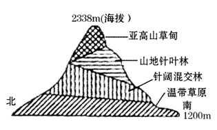 小题1:根据该山山麓地带为温带草原,有针阔混交林的分布,该山为天山。相同自然带在北坡分布的海拔高。天山北侧受来自于大西洋和北冰洋的水汽影响,水分条件好。所以本题选择D选项。