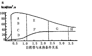 3、单选题 读图9“自然带与水热条件关系”,A~H表示不同的自然带。关于图中自然带的描述,正确的是(R为年幅射差额,即热量收入;R/Lr为干燥指数,指数越大,表示越干燥) (?)