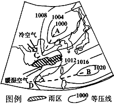 1、综合题 读“5月某日等压线图(单位hPa)”,分析回答下列问题。
