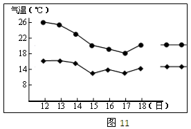 3、单选题 图11是我国某地一段时期的最高气温与最低气温变化曲线图,在此期间,该地