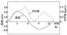 2、单选题  河流河口段是径流和潮流相互作用的区段,河口段水流做周期性往复运动。在一个潮流周期中经历涨急涨憩和落急落憩,其中落急是指潮流流速由最大降低为0的阶段。在这一过程中泥沙频繁地悬扬和落淤、前进和后退。下图为河口流速(指向下游)和含沙量过程线示意图。完成下列问题。
