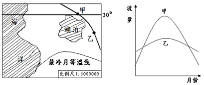 2、单选题 如图所示区域陆地地势平坦,右图为图Ⅰ中河流甲、乙两处的年径流量曲线。读图回答下列各题。
