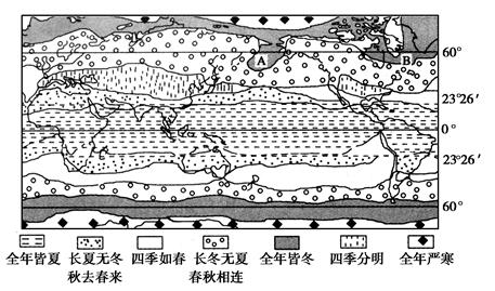 2、综合题 下图为“某学者划分的世界四季类型分布图”,据图完成下列问题。(10分)