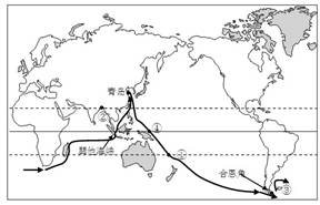 5、综合题 中国帆船能手郭川驾驶“青岛号”无动力帆船斜穿太平洋,绕过合恩角,越过大西洋和印度洋,经巽他海峡北上,于2013年4月5日荣归青岛,成为驾驶40英尺以下帆船,成功完成单人不间断环球航行的世界第一人。图为此次航行路线示意图,读图回答下列各题。(13分)