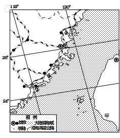 (1)此题首先要根据经纬度进行海峡区域定位,确定该海峡为台湾海峡,其次根据东海岸的海岸线平直,可判断该海岸的主要类型是砂质(沙砾质)海岸和淤泥质海岸。