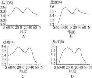 本题解析:解答此题应认真阅读教材“海洋表层盐度、温度随纬度的变化图”,特别应注意60°N附近海区盐度比南半球同纬度区域低。