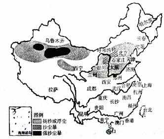 材料一? 2010年3月21日至22日,一次强沙尘天气侵扰我国,使南疆盆地、内蒙古中西部偏北地区、甘肃中西部、陕西北部、华北北部等地出现扬沙或浮尘天气,内蒙古西部偏北、南疆盆地等地的局部地区出现强沙尘暴。
