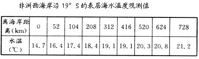 (1)分析沿19°S表层海水温度的分布规律及形成的主要因素。