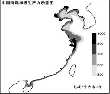 海洋初级生产力是指海洋中的藻类、浮游生物等初级生产者,生产碳、磷基本营养元素的能力。海洋初级生产力决定了鱼虾蟹等海洋生物的饵料之丰寡,进而决定某海域的海产品产量之高低。读“中国海洋初级生产力示意图”,完成下列问题。