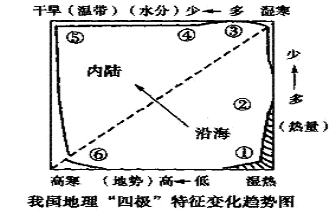 小题1:下列关于我国地理“四极”特征变化趋势图正确的是(?)