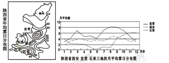 4、单选题 一般规定一天内能够观测到大雾或雾凇均统计为一个雾日。读陕西省的年平均雾日分布图(左图)和陕西省三地的月平均雾日分布图(右图),回答下列各小题。