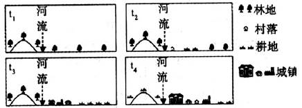 2、单选题 下面为一组剖面示意图,该组图反映了我国华北某地区土地利用状况由tl至t4时期的历史变化过程(t1至t4时期气候变化甚微,可忽略不计;图中河流断面位于中游处)。据图回答13~14题。