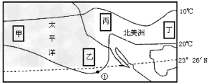 小题2:结合上题分析,若L1、L2的流向相同,即L1洋流呈自东向西流,为北半球冬季,则地球公转运行到近日点附近,①正确;北京昼短夜长,②错误;亚欧大陆上形成亚欧高压,故海洋上为低压,③错误;亚欧大陆上气温较同纬度海洋上低,故等温线向低纬凸出,④正确。