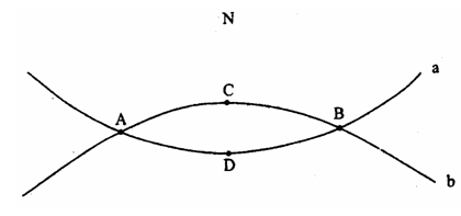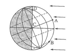 3、单选题 图所示地区位于北半球,弧线a为纬线,弧线b为晨昏线,a、b弧线相交于A、B两点,D、C两点分别为a、b弧线上劣弧AB的中点,N为极点。读图回答下列各题。