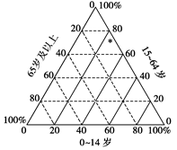小题1:本题考查地理图表的判读能力。根据图示:图中0~14岁人口的比重的度数方法为找到坐标轴,然后平移65岁以上人口的坐标轴,得到读数为23%。所以本题选择B选项。