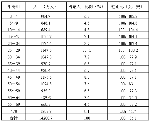 小题1:据我国第五次人口普查,全国共有12.95亿人,图中“*”表示人口年龄构成状况,其中0~14岁人口的比重约是(?)