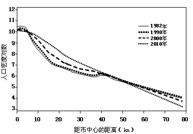 小题1:由图可以看出:1982-2010年间,越近市中心区人口密度数降低,距市中心5-40km处人口密度数增加,超过40km人口密度对数下降,A正确,B错,近郊区人口密度是增加的,C错;远郊区人口密度是下降的,D错。选A正确。