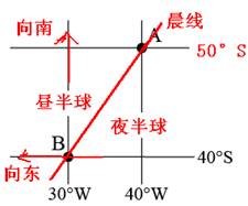 【小题2】若此日A、B两点同时日出,那么A、B两点都位于晨线上,所以图中晨线的左侧是昼半球,(如下图所示)对于南半球来说,纬度越高,白昼越长,B点纬度是50°S,故此日A点昼长大于B;此时北半球是夏季;那么此季节北印度洋季风洋流流向为逆时针;亚欧大陆上的等温线向南弯曲;此时太阳直射点位于南半球,地球公转速度较快;故选项B正确。