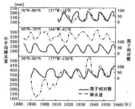 (1)70°N~80°N的降水量变化与黑子相对数之间的关系是____________________。