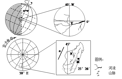 (5)题根据所学知识判断Y与M两处气候类型相同均为热带雨林气候,Y位于亚马孙平原,赤道附近,故终年受赤道低气压带控制;马达加斯加岛位于东南信风带,M处于岛上的山脉以东,受来自海洋的湿润的东南信风的迎风坡,多地形雨;另外,受沿岸马达加斯加暖流的影响,具有增温增湿的作用。