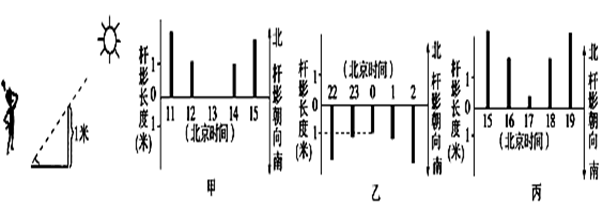 【小题2】根据图中信息:6月22日甲乙丙三地影子长短朝向及长短可判断当地经度。影子最短时并左右对称说明是正午太阳高度,即为当地地方时为12点,结合北京时间可推断当地的经度。甲地北京时间为13点,当地为12点,因此甲的经度为120°E-15°(13-12)=105°E, 乙的经度为120°E-15°(0-12)=60°W,丙地经度120°E-15°(17-12)=45°E。当乙地测得该日杆影长最短时,即当地为12点,由此可推12-(45+60)/15=19。故D正确。