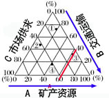 过③点,画出与C边的平行线,与A、B均有交点,与A交点读数是60%,与B交点的读数是40%。该取哪个呢?取向顶点数值增大的边,即“A?矿产资源”这边。说明工业③受矿产资源影响的程度是60%。