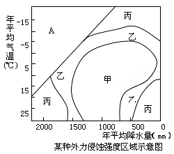 【小题1】据图分析甲区域的气温和降水的数据可知,该外力侵蚀在水热相对充足的情况下侵蚀度较大,由此推断该外力作用为流水侵蚀作用。故选B。北美五大湖是冰川作用形成,长江三角洲是流水沉积而成,风蚀城堡是风力侵蚀的产物。